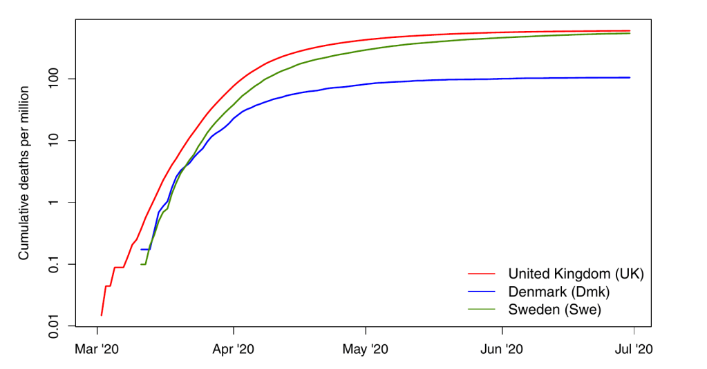 As you can see, Denmark, Sweden, and the UK had widely varying outcomes. They also had widely varying policies, so it’s natural to ask how much these are to blame. Luckily, epidemiologists have developed extremely precise tools to quantify this effect, the results of which are shown below: